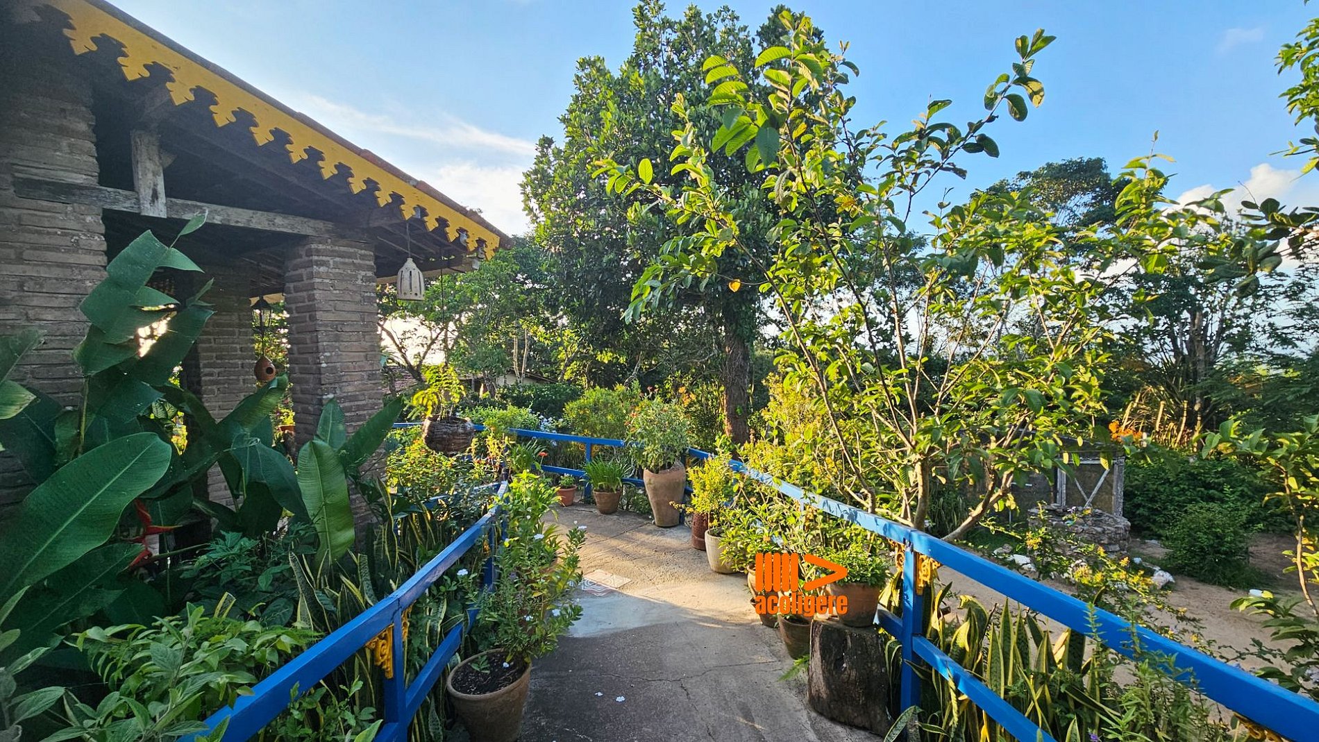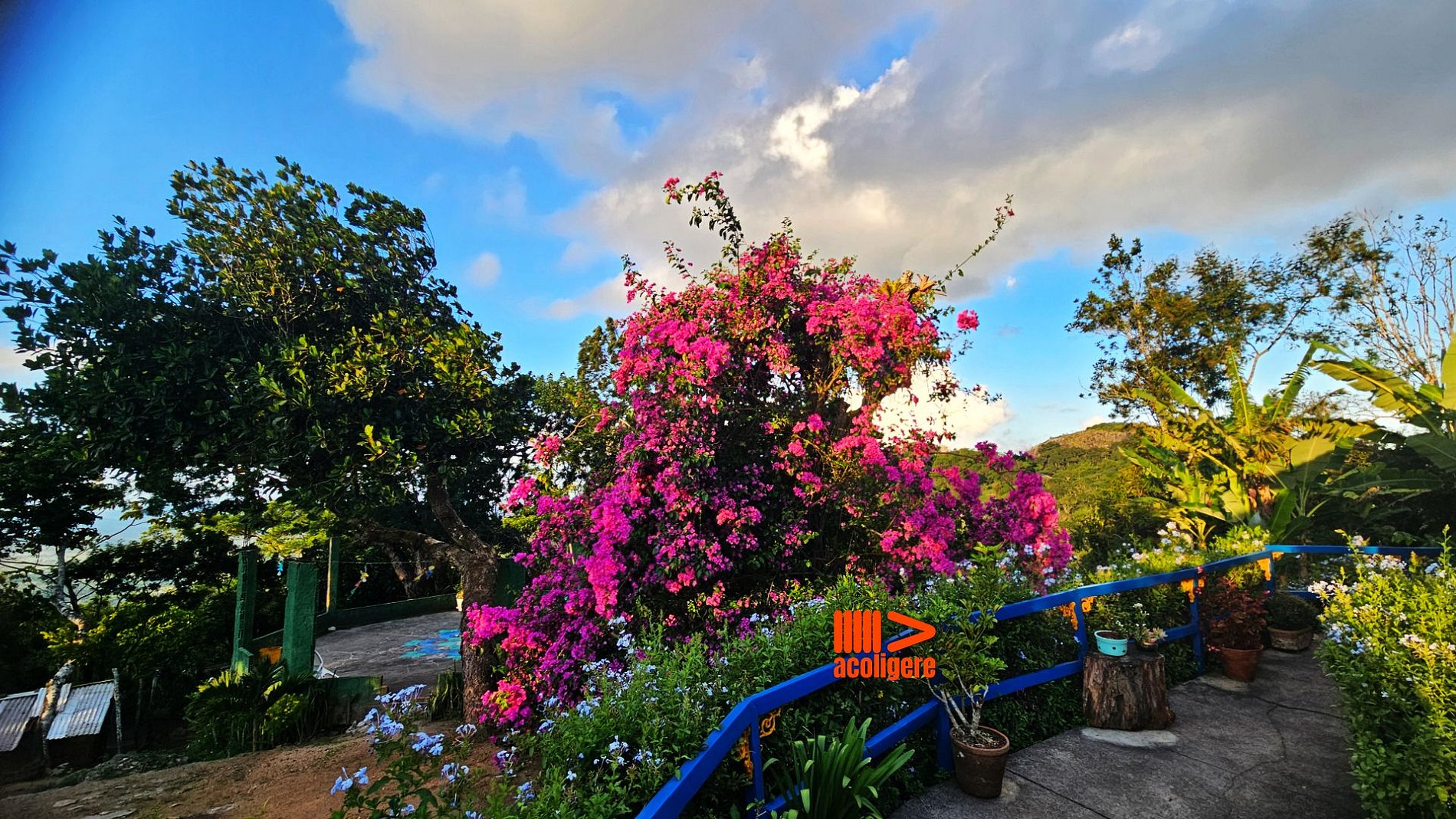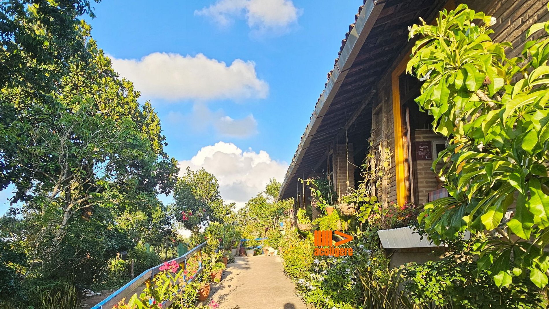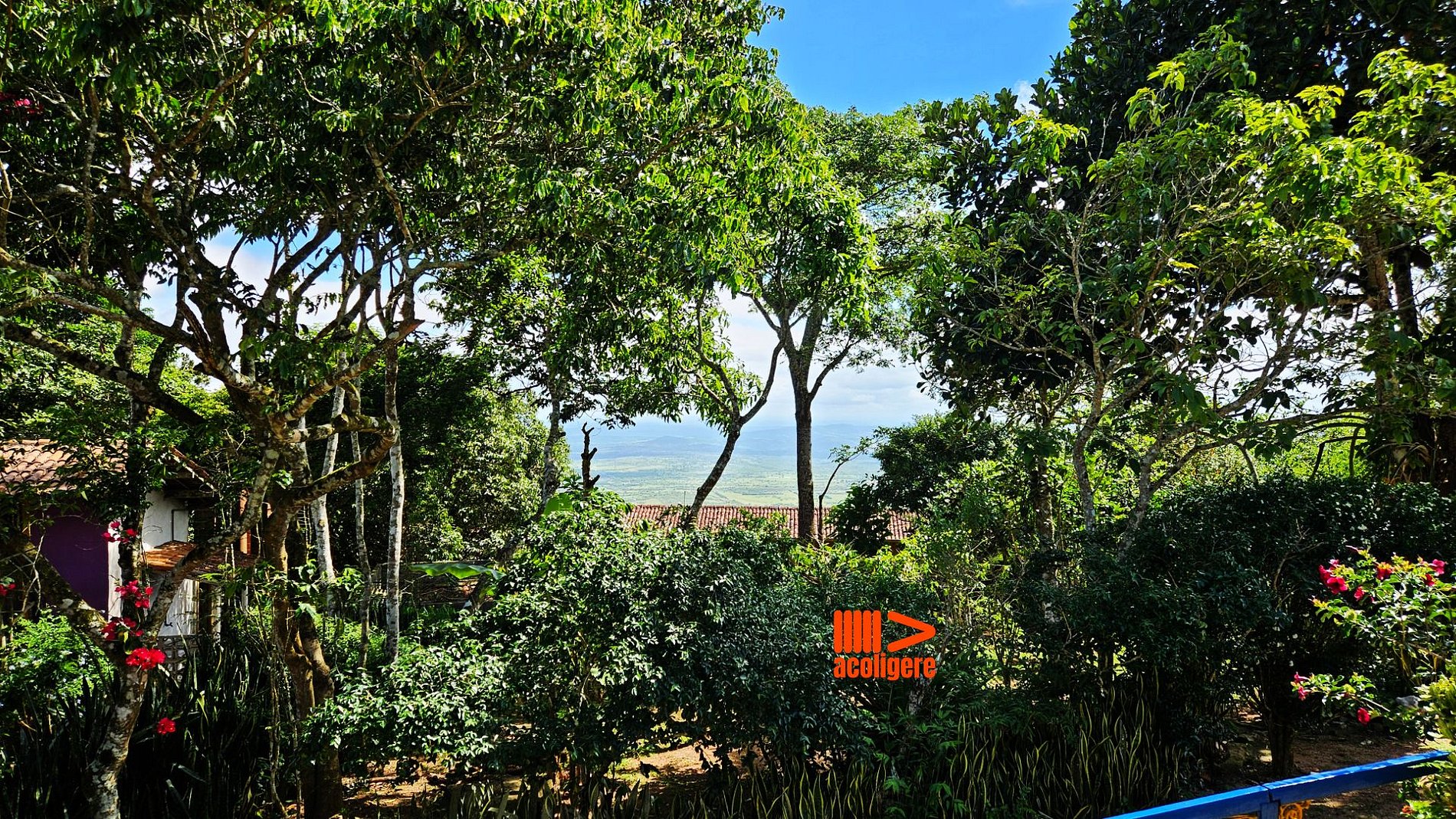 Um refúgio acolhedor entre flores, árvores e montanhas.