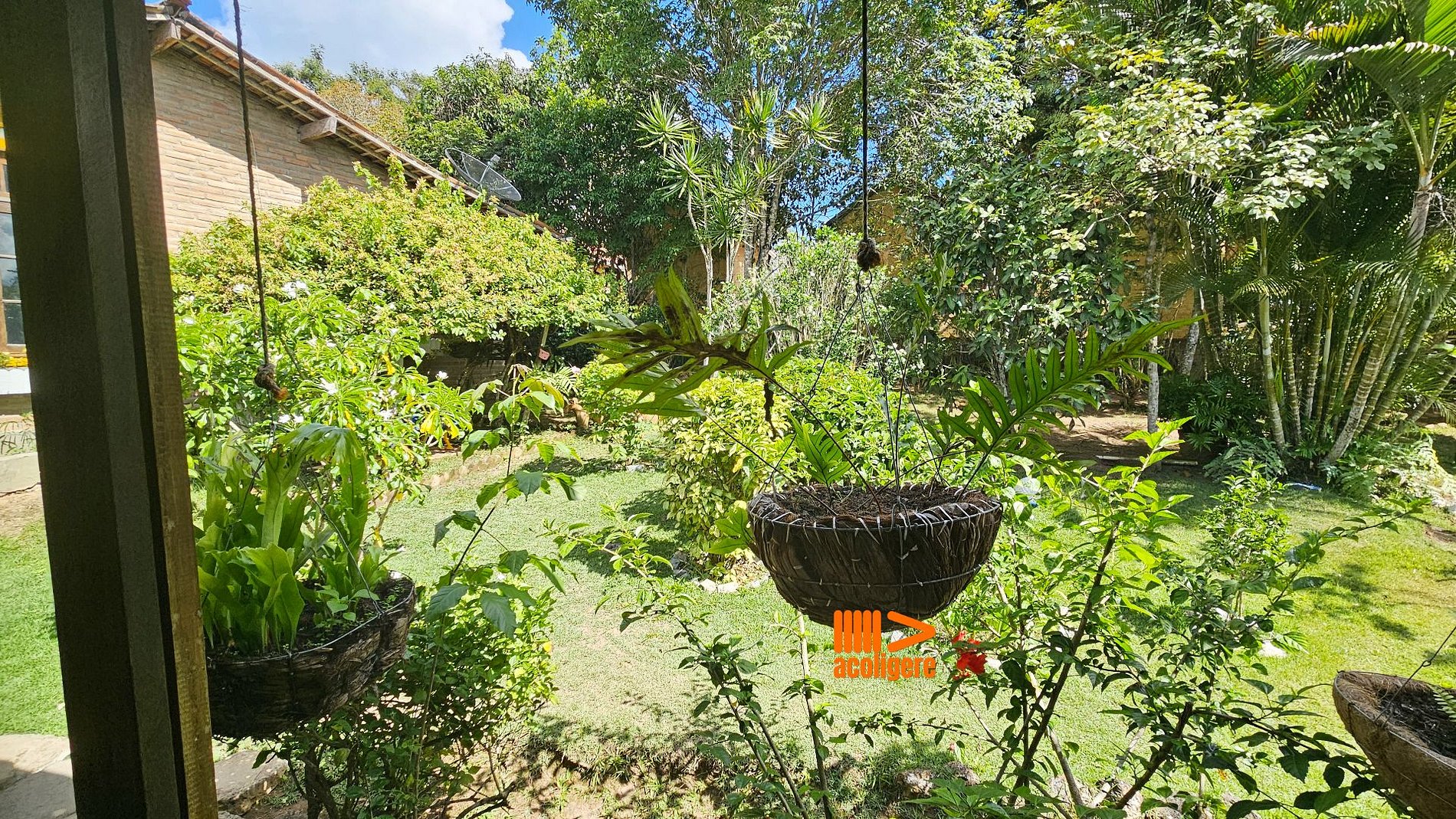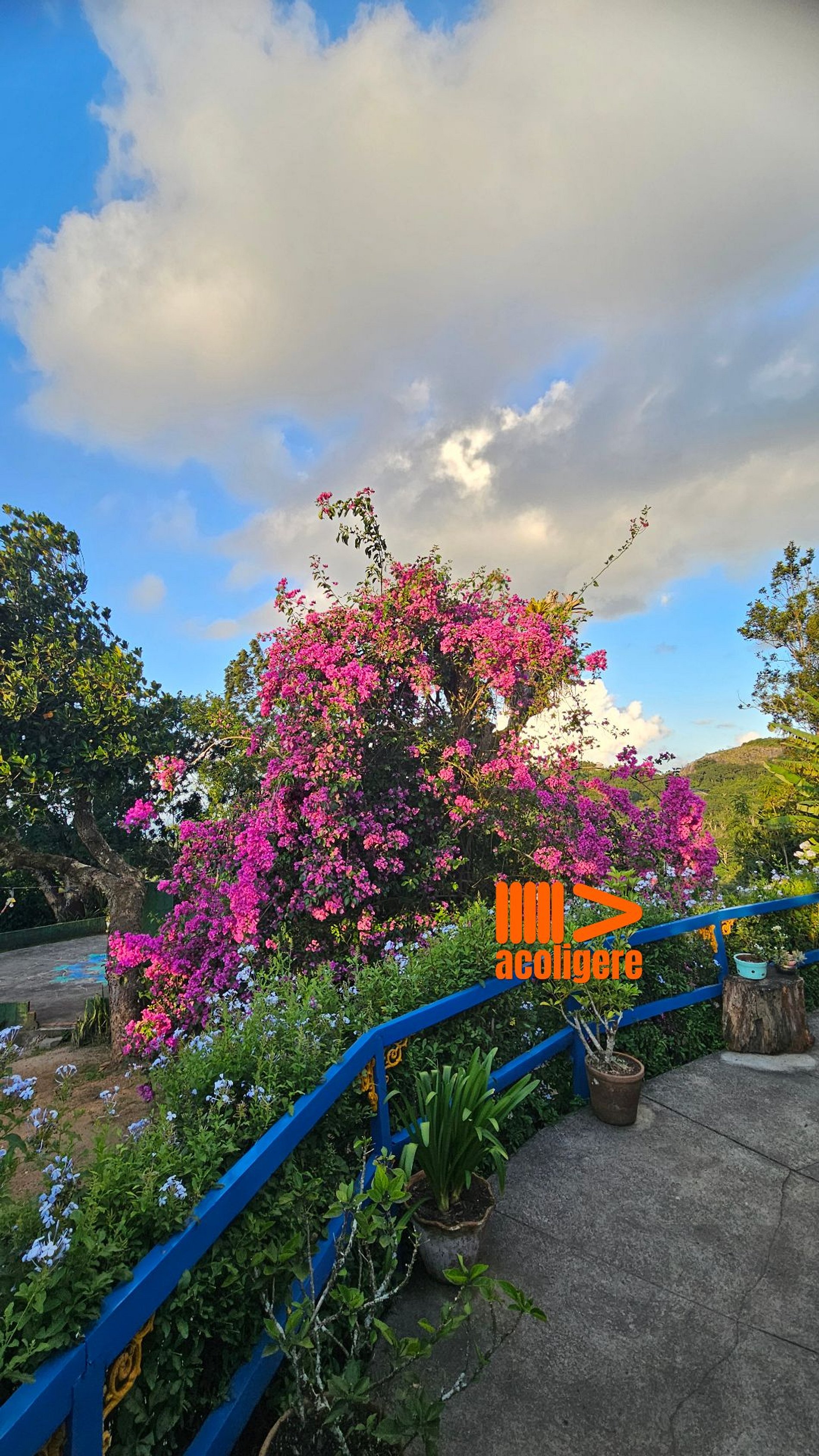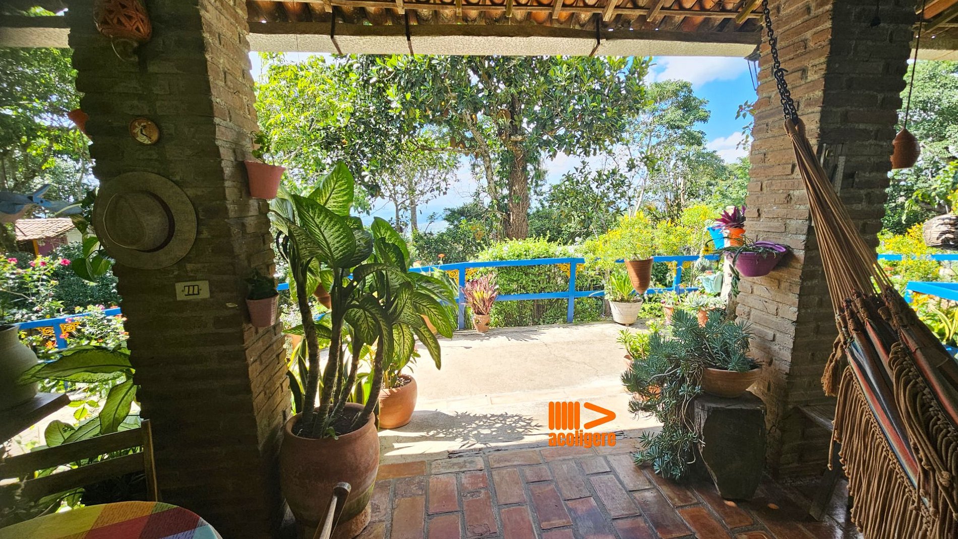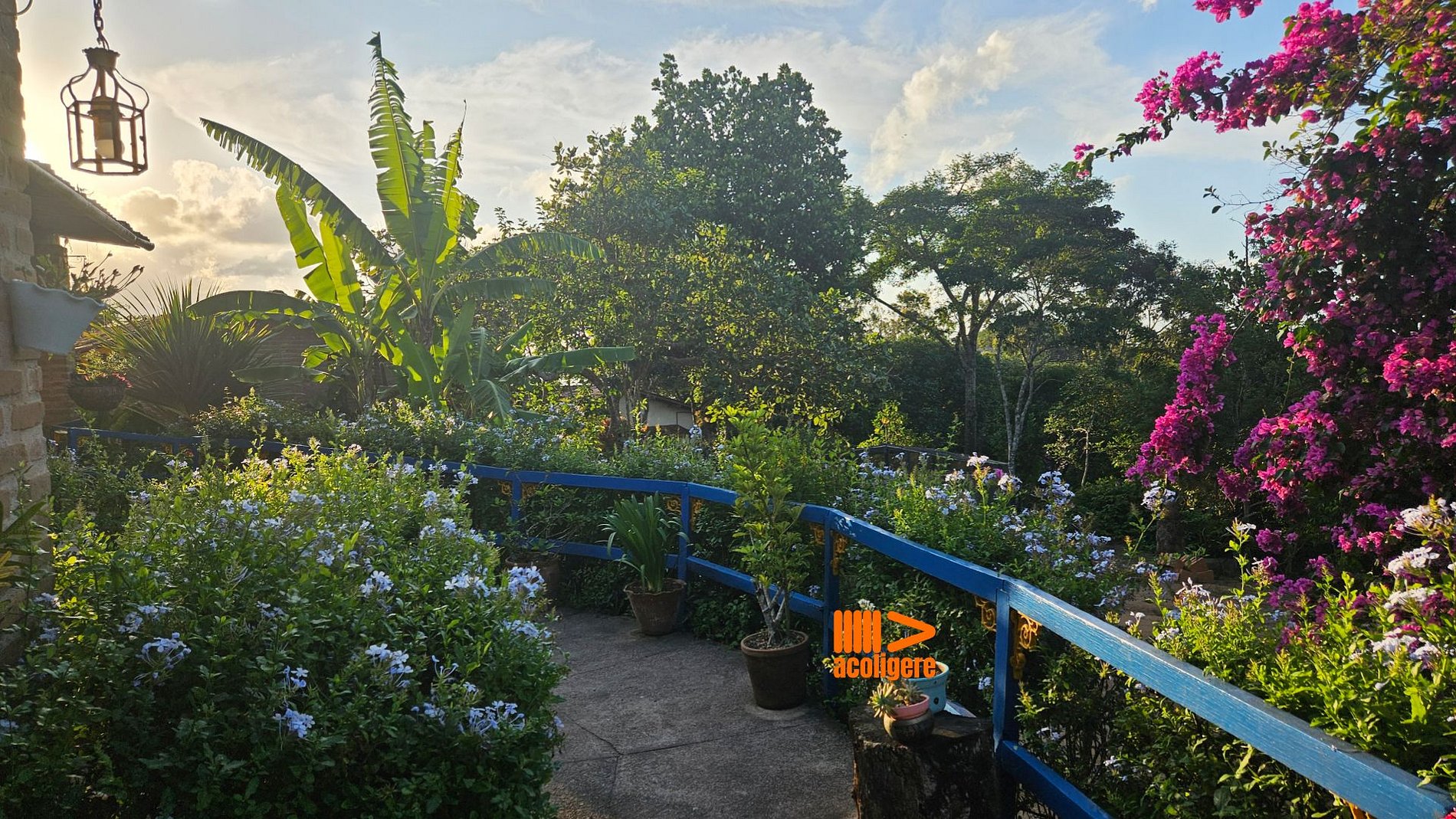 Um refúgio acolhedor entre flores, árvores e montanhas.